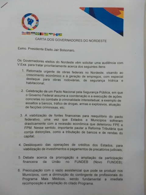 O Blog adianta a íntegra da carta dos governadores eleitos e reeleitos do Nordeste, fechada na manhã desta quarta-feira em Brasília, e que será entregue ao presidente eleito Jair Bolsonaro.